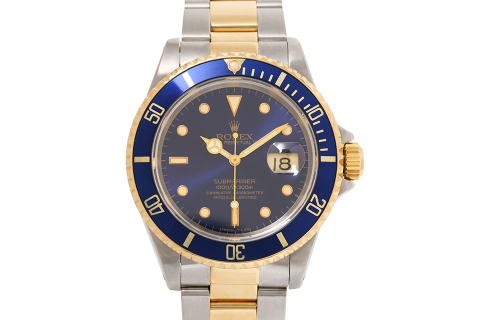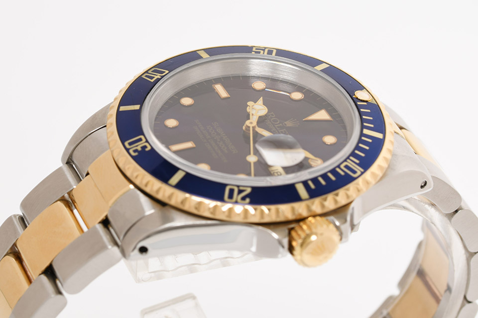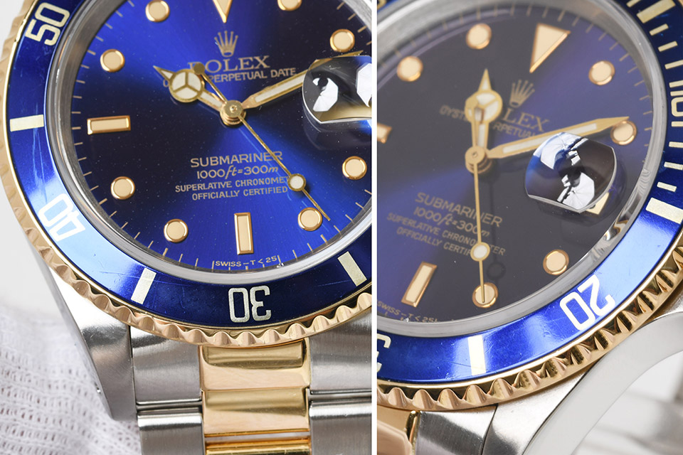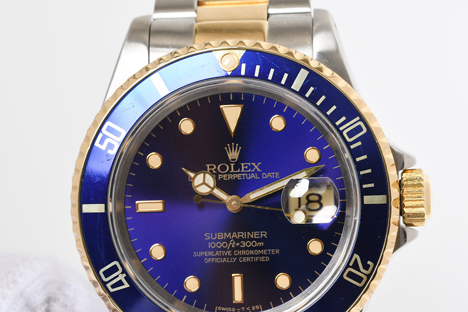 ベゼルと裏蓋に小傷、文字盤に少しヤケ(角度によってヴァイオレットに見えます)と僅かに腐食、ガラスに僅かに欠けが見られますが、機械点検・新品仕上げ済みでコンディション良好です。箱・保証書・赤タグあり。バースデー6ヵ月保証付。