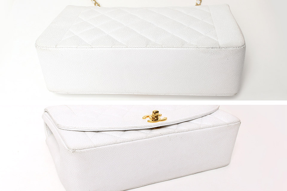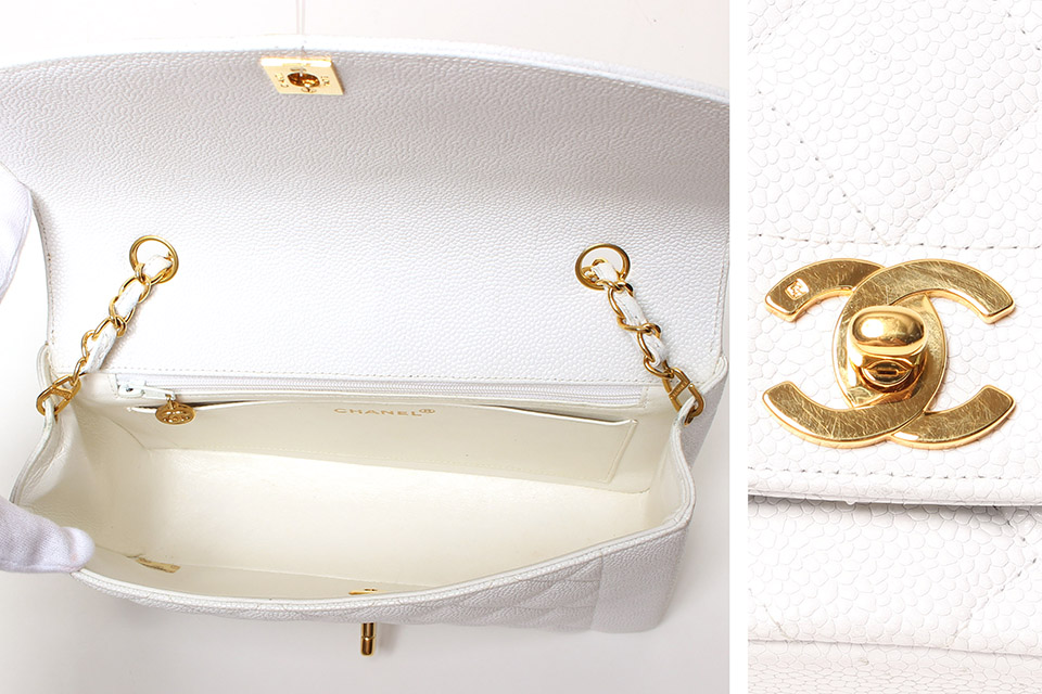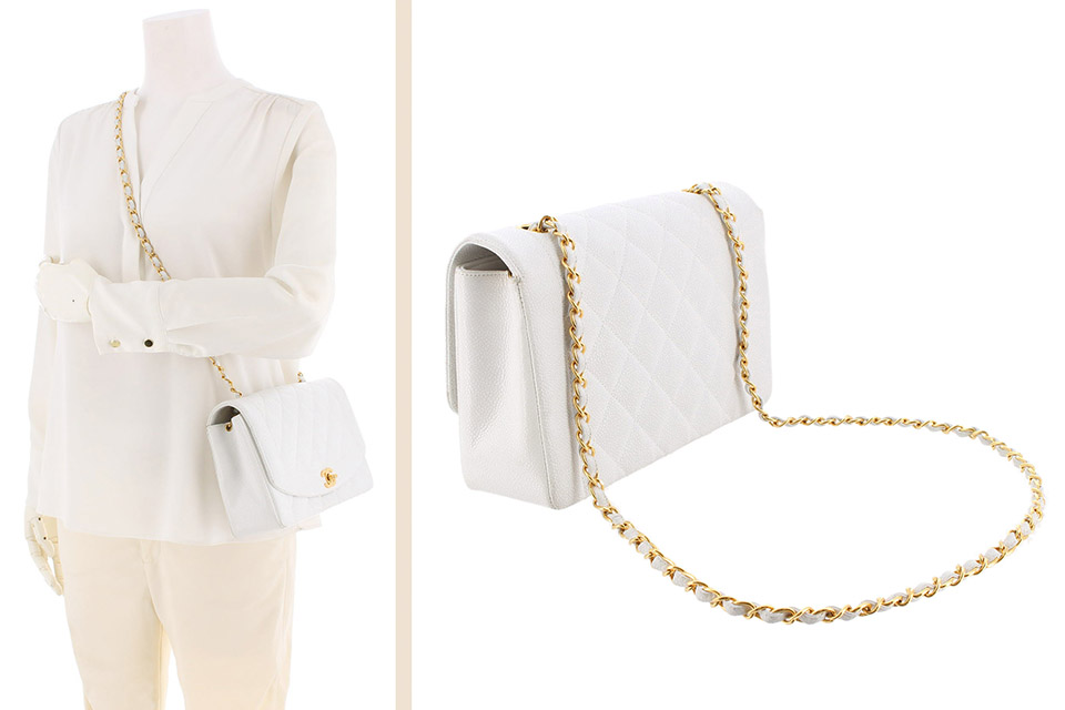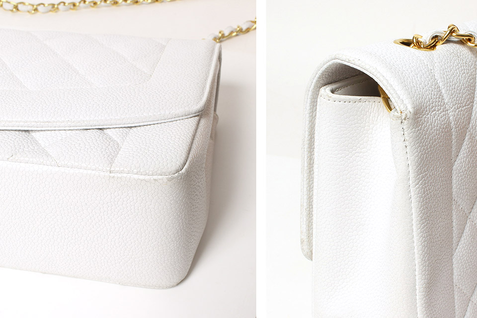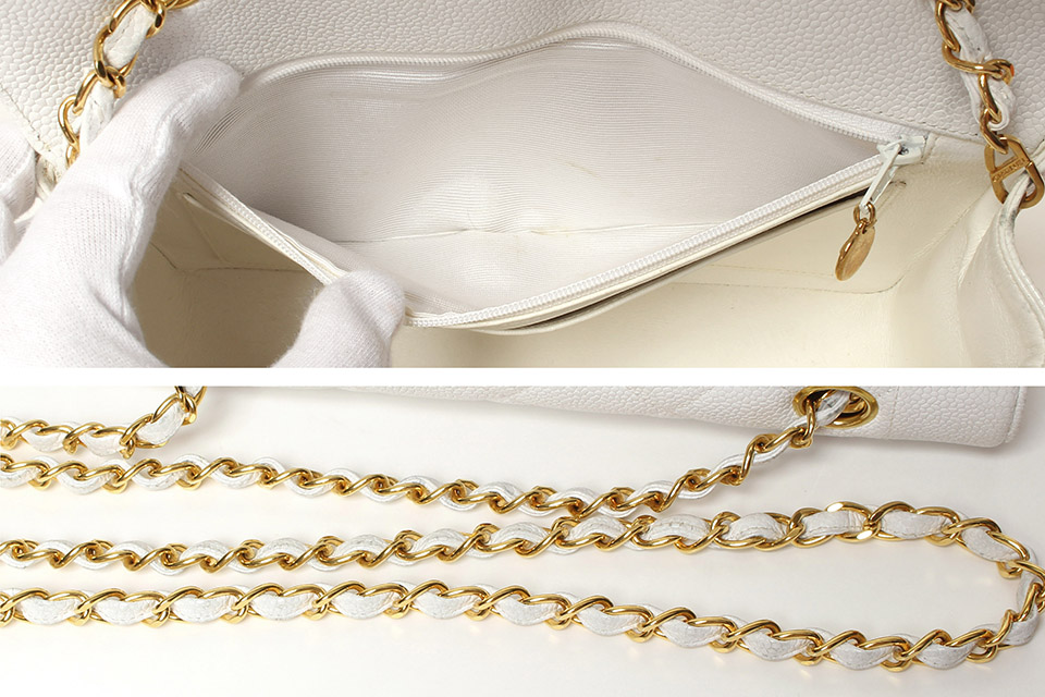 金具に小傷、四隅やフチにスレ、レザー表面や内側に少しスレ、背面、内側ポケットやチェーンレザーに薄汚れが見られます。箱・Gカードなし。保存袋あり。