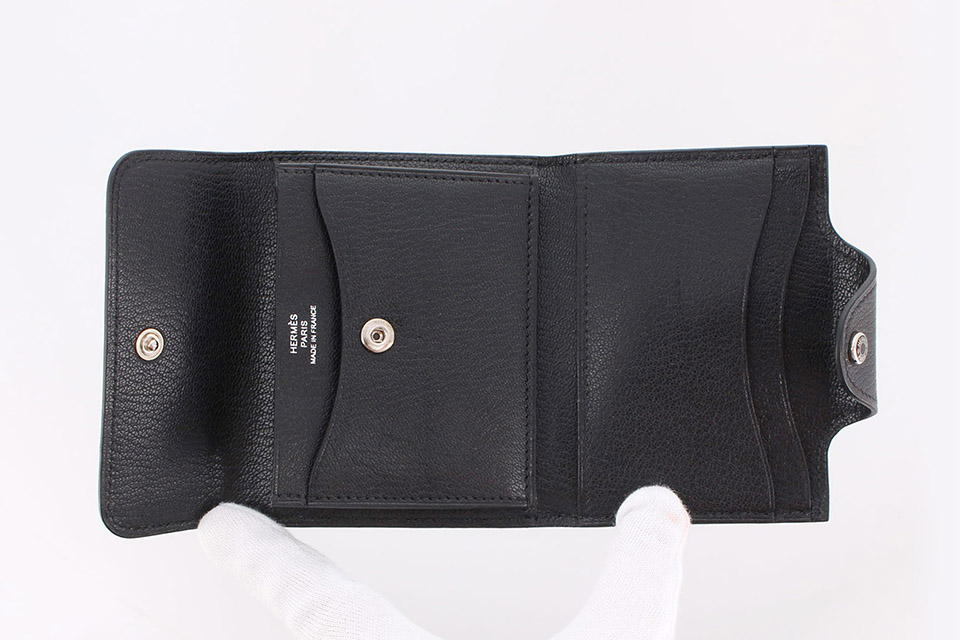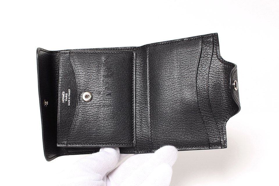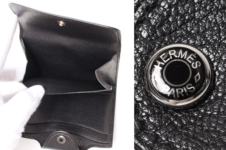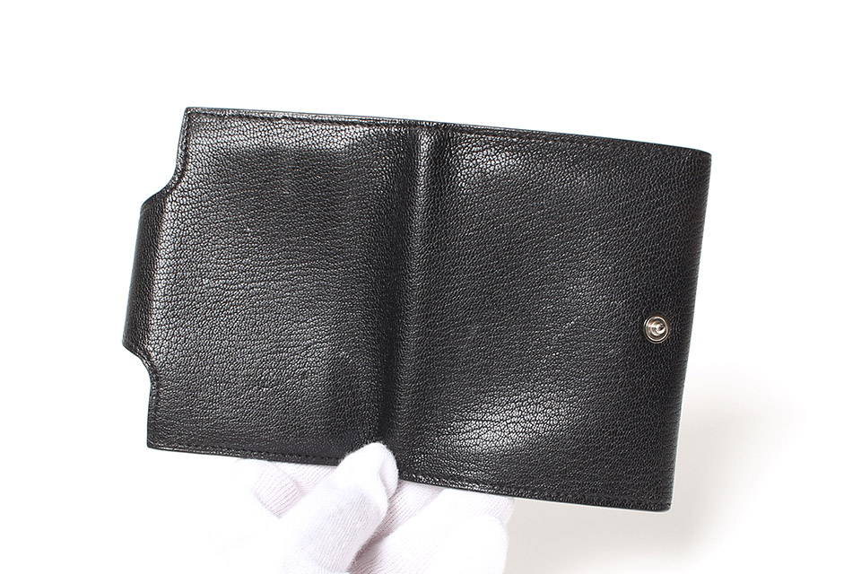 金具に僅かな小傷、レザー表面や内側にスレと型付き、ポケット内にラメや薄汚れ、少し型崩れが見られます。箱なし。