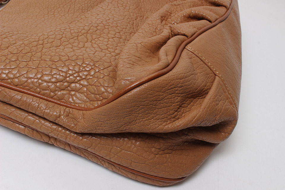金具に小傷、四隅にスレ、開口部フチやハンドルレザーに少しスレ、レザー表面に若干薄汚れ、型くずれが見られます。箱・保存袋なし。