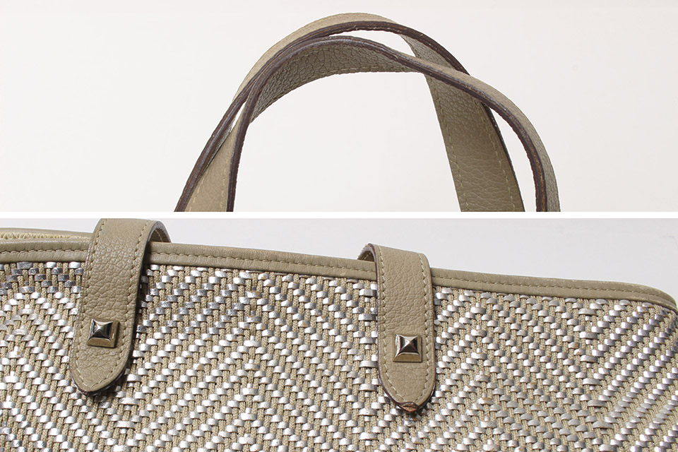 金具に小傷、四隅、開口部レザーやハンドルのコバにスレ、ハンドル付け根に少し剥がれ、内側に薄汚れが見られます。箱・保存袋なし。