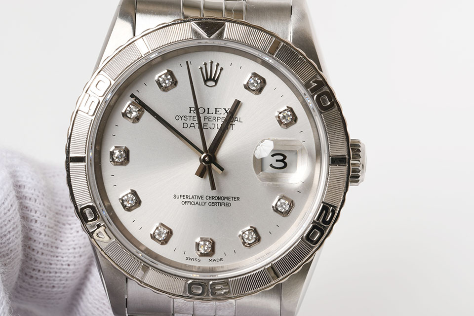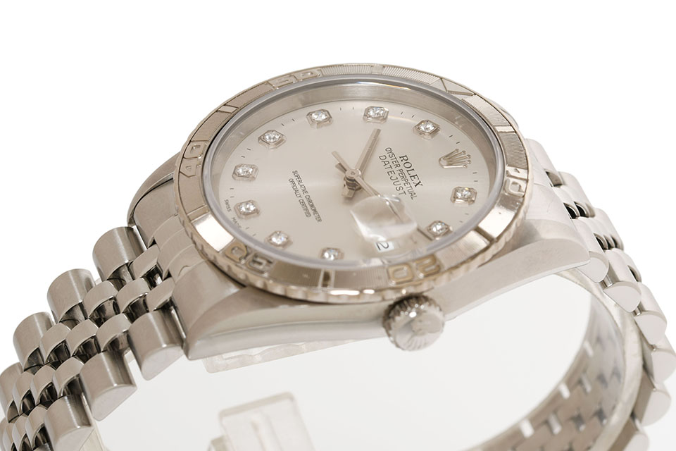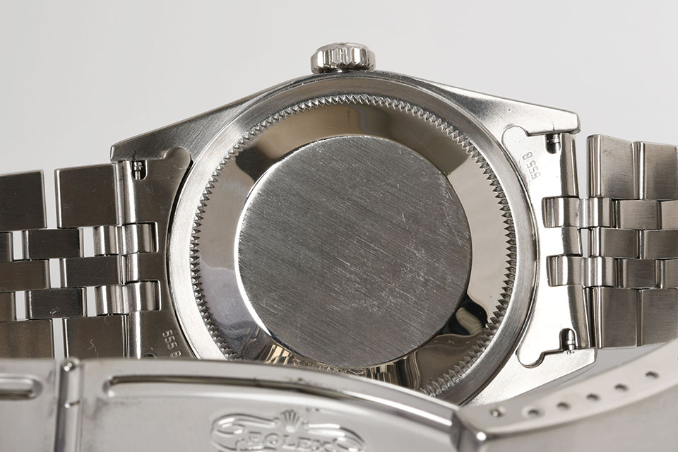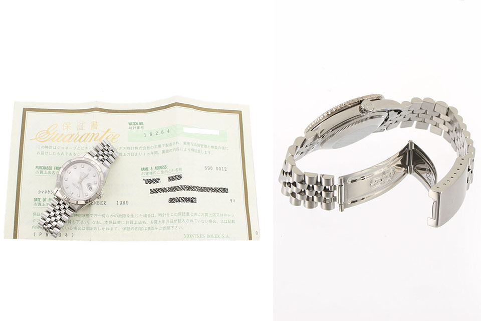 ベゼルに小傷と打痕、裏蓋と針に小傷、文字盤に僅かに色ヤケ、ベルトにやや伸びが見られますが、機械点検・新品仕上げ済みでコンディション良好です。箱なし。保証書(名前消し)あり。バースデー6ヵ月保証付。