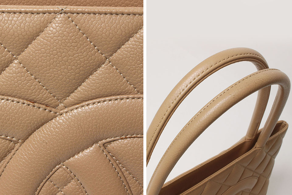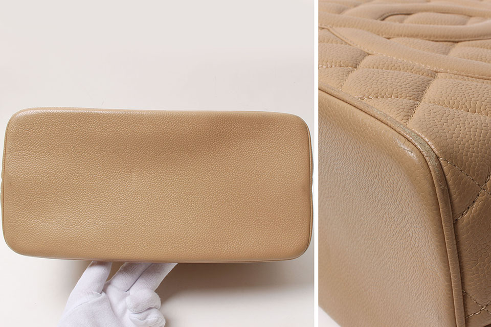金具に小傷、四隅にスレ、ハンドルやレザー表面に薄っすらスレや薄汚れ、内側にスレ、底に少し型崩れが見られます。箱・保存袋なし。Gカードあり。