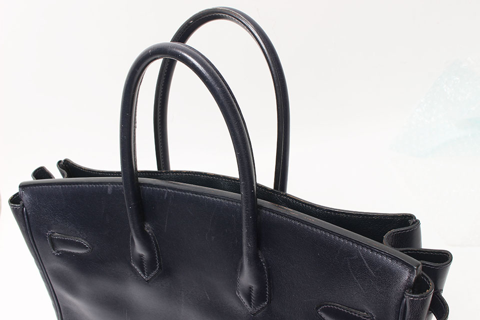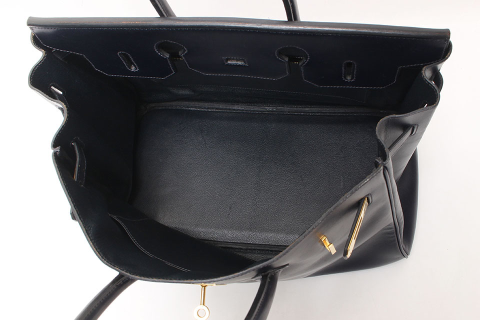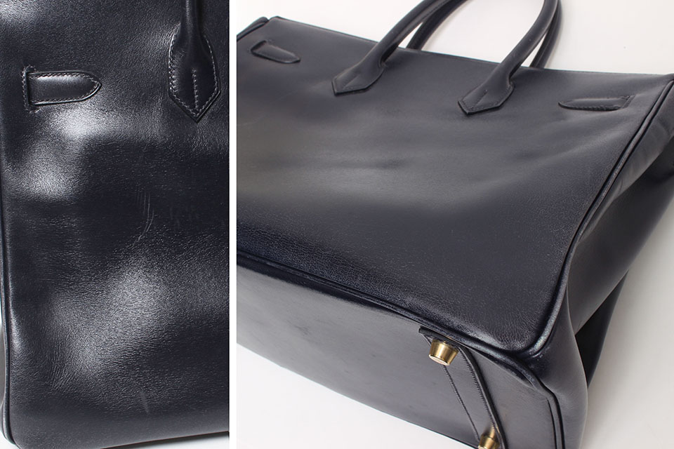金具に小傷、四隅、パイピング、ハンドル、ベルトやレザー表面にスレ、開口部やハンドルのコバにスレや色剥がれ、内側にスレや型付き、型くずれが見られます。箱・保存袋なし。カデナ・鍵2個・クロシェットあり。
