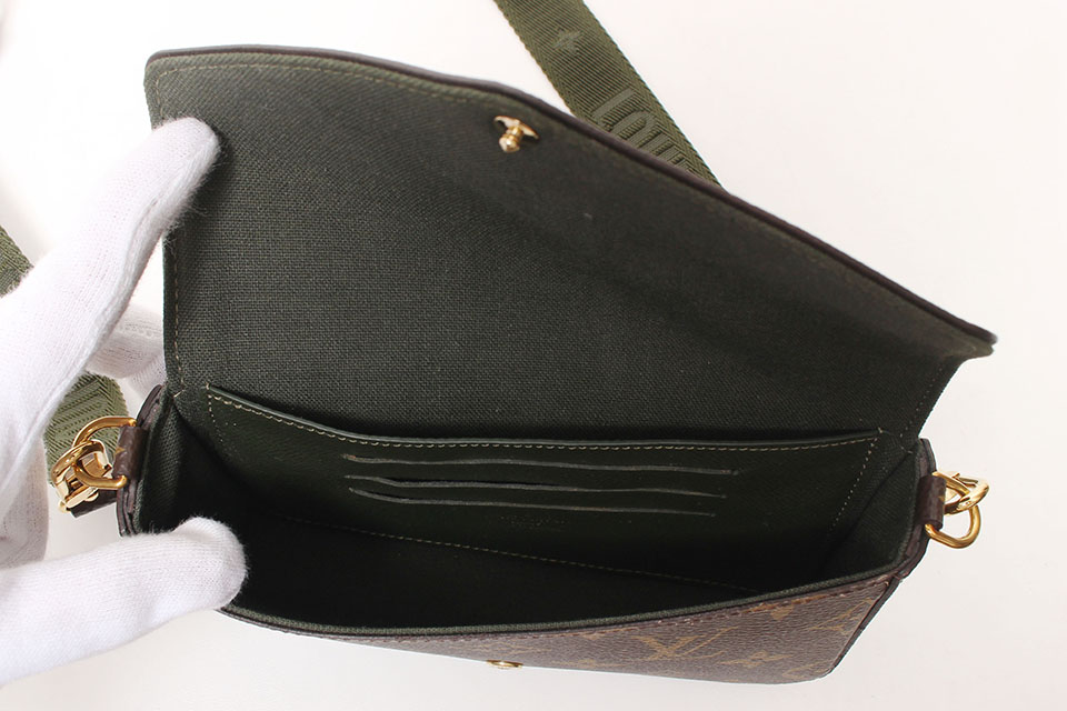 金具に小傷、フラップのフチに少し反り、内側カード入れに浮きが見られますが、全体的に状態は綺麗です。箱なし。保存袋・ポーチ・ショルダーストラップあり。