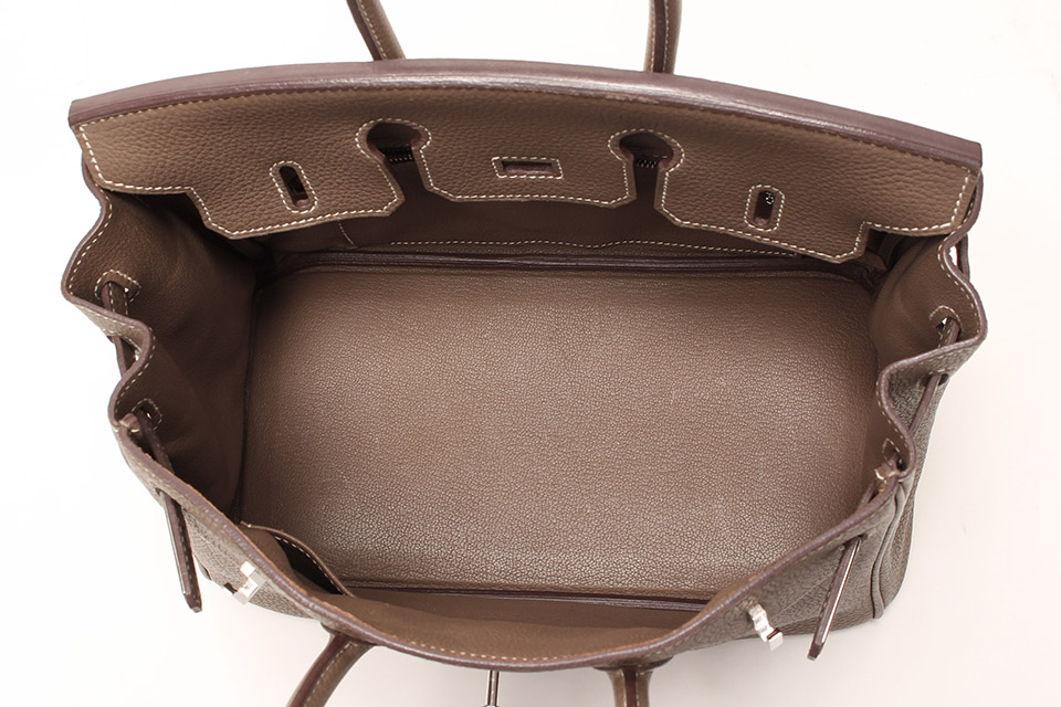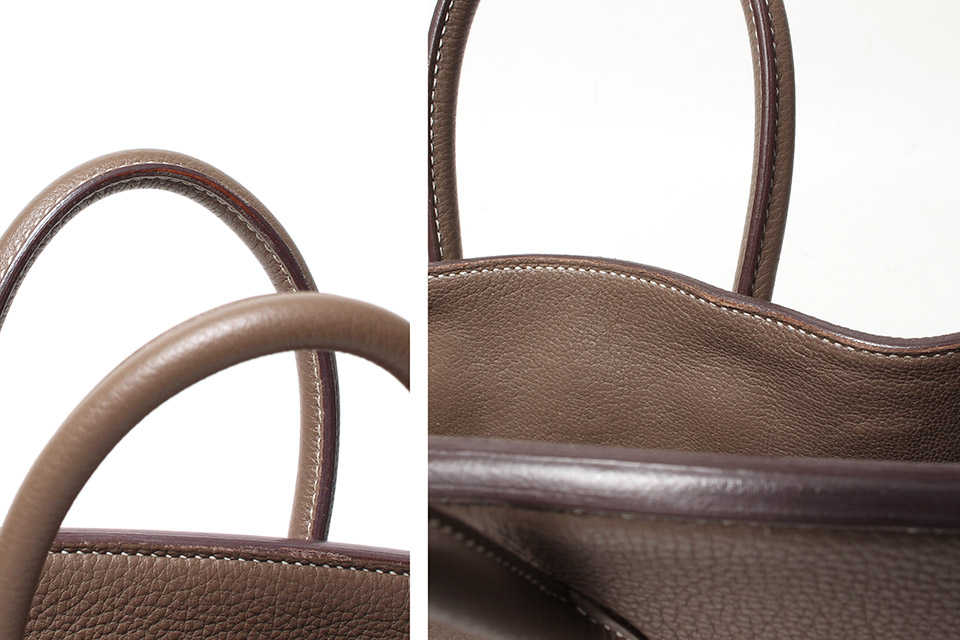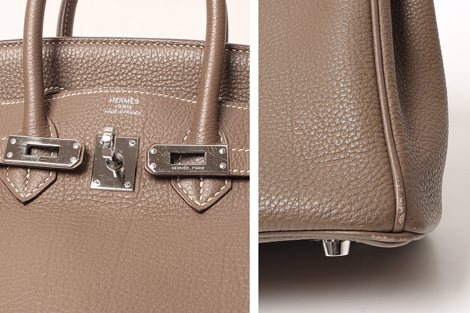 金具に小傷、四隅にスレ、ハンドルや開口部のコバにスレ、内側にスレや型付き、少し型崩れ、トゴ素材特有の血筋が見られます。箱・保存袋なし。カデナ・クロシェット・鍵2個あり。