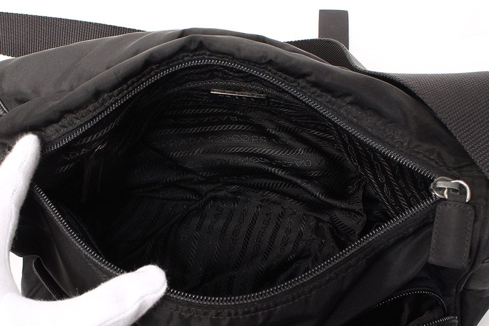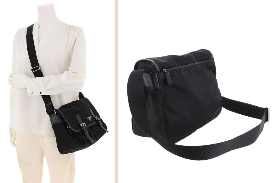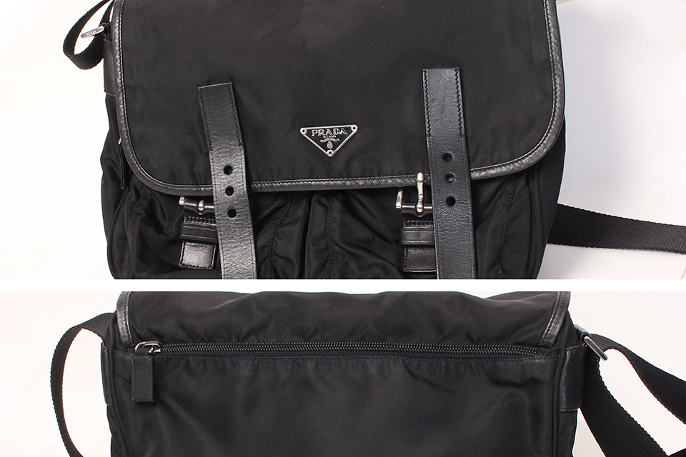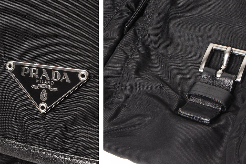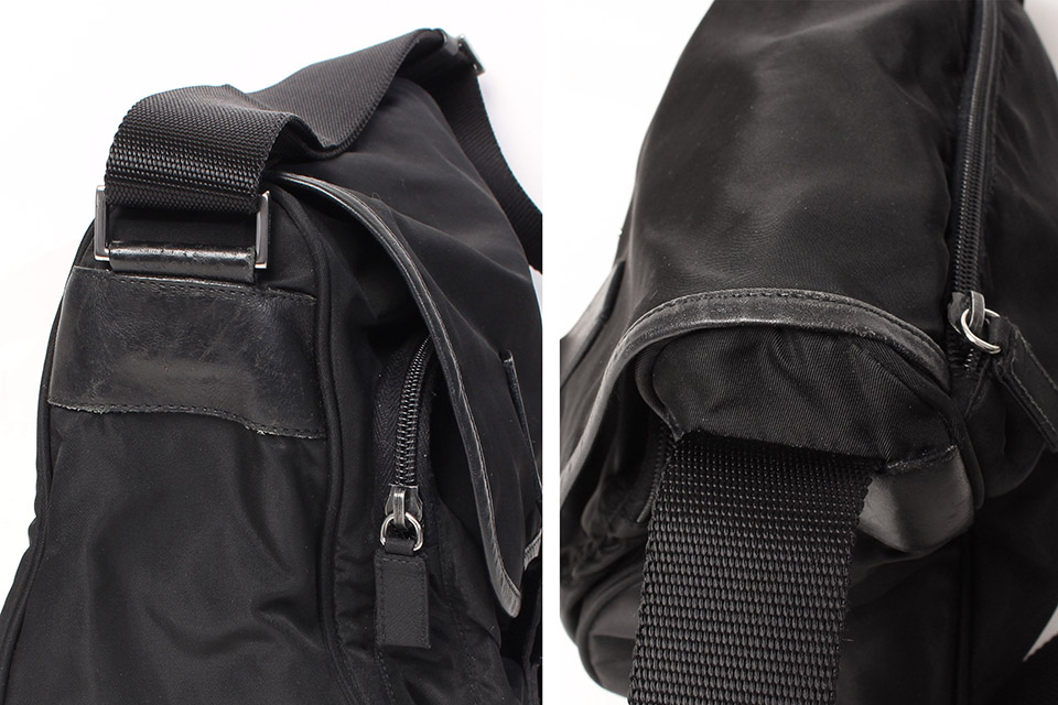 金具に小傷、レザー部分にスレ、ナイロン表面に薄っすらスレ、ポケットに小さな破れ、型崩れが見られます。箱・保存袋なし。Gカードあり。