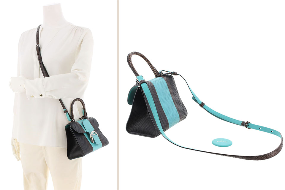 金具に小傷、ウロコに毛羽立ち、スレや薄汚れ、内側に少しスレやヤケが見られます。箱・保証書なし。ミラー・ショルダーストラップあり。