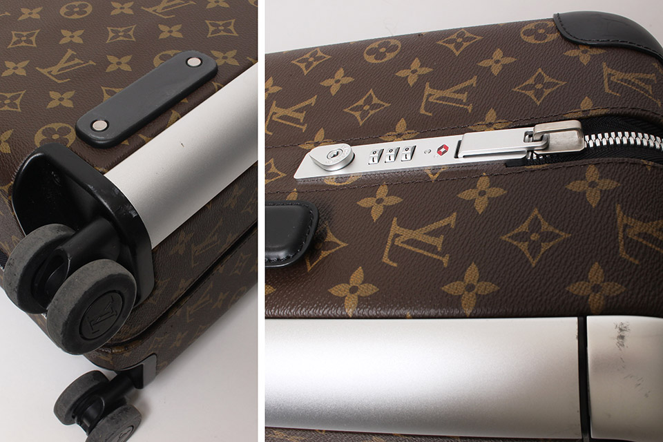 コマ付近のプラスチック、ハンドルのステンレス、四隅やレザー部分にスレや小傷は見られますが、全体的には綺麗です。保存袋なし。ネームタグあり。柔軟剤のような香りが残っています。RFID確認済。