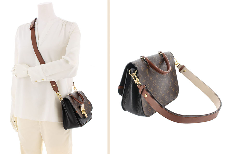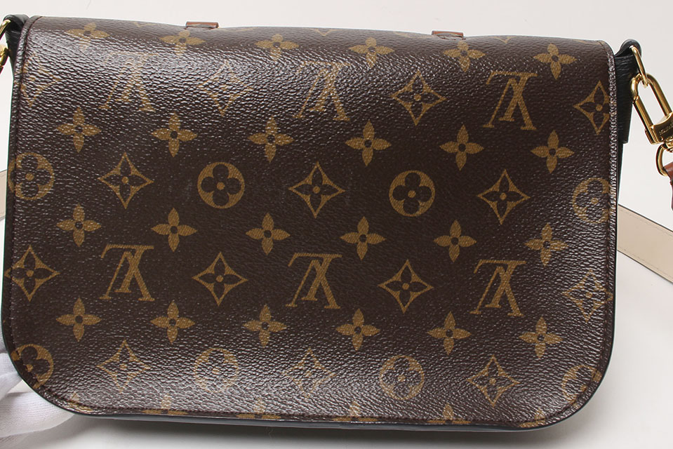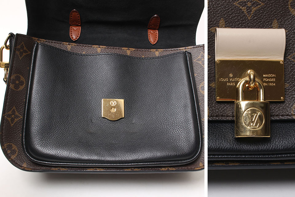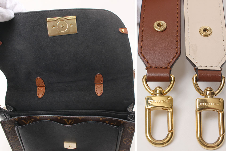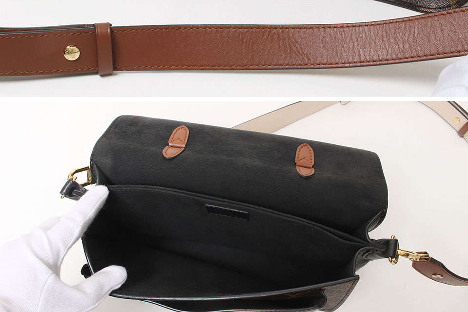 金具に小傷、フラップ内側のレザーポケットと底面のレザーにスレと型付き、内側にスレや薄汚れ、ストラップにシワが見られます。箱なし。保存袋あり。