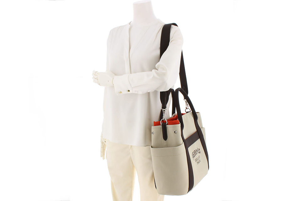 金具に僅かに小傷、内側オレンジ地に1ヵ所僅かな薄汚れが見られますが、保存袋・ショルダーストラップ付きの未使用品です。箱なし。